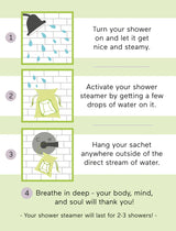 How To Use: Simply wet your shower steamer and hang your sachet anywhere outside of the direct stream of water. Enjoy the spa-like aromatherapy experience!